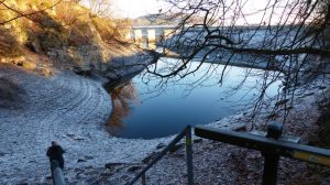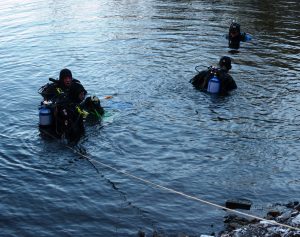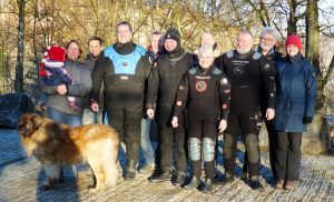Morgens um 9:00 trafen sich bei aufgehender Sonne einige Mitglieder zum Abschlusstauchgang 2016. Vier Taucher bereiteten sich im Trockentauchanzug auf einen Tauchgang bei einem geringen Wasserstand vor.